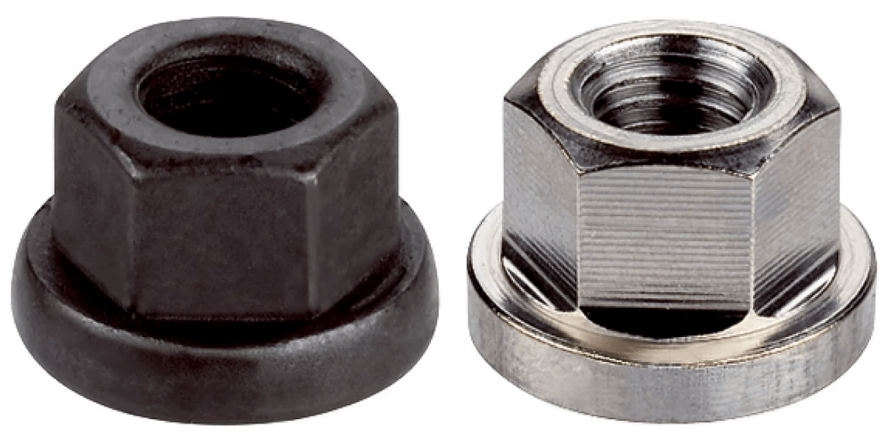 З фланцем. На нижній частині має розширювальний фланець (спідницю). Він збільшує площу притискання. Фланцева гайка застосовується під час встановлення крихких матеріалів, запобігаючи їхньому пошкодженню під час затягування кріплення.